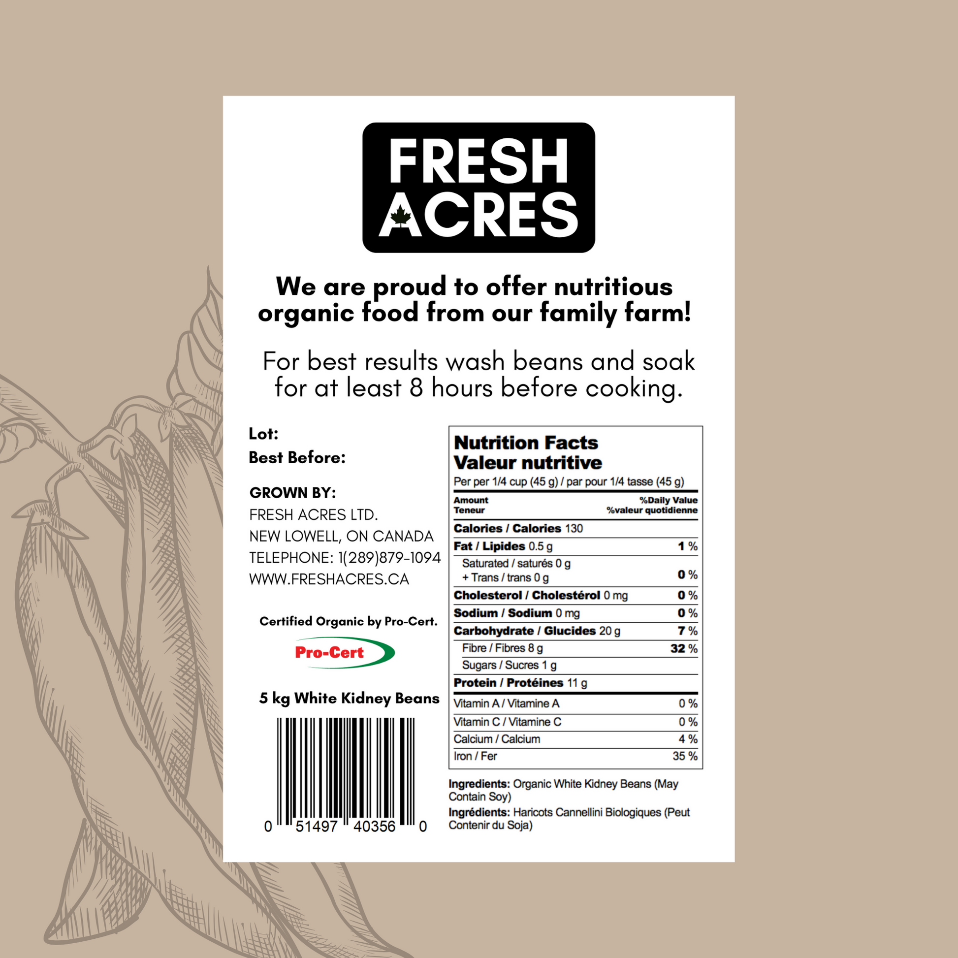 Fresh Acres Organic White Kidney Beans are available in 1 kg (2.2 lb), 4.54 kg (10 lb) or bulk 11.34 kg (25 lb) bags. All of our crops are locally grown in Ontario on our farm! The price per pound ranges from $2.28/lb-$4.08/lb.